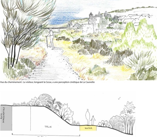 L’objectif est de valoriser le paysage de La Caunette, d’inviter à la découverte du village-rue mais aussi de l’ensemble du territoire du Grand Site. La création d’un cheminement sur la berge Sud de la Cesse permet de diversifier et d’enrichir le maillage piéton en offrant des points de vue sur La Caunette et en redonnant accès aux berges de la Cesse.