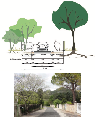 La structure viaire de Saint-Mathieu repose sur les « camis », chemins carrossables bordés de chênes qui doivent conserver leur gabarit étroit et leurs qualités paysagères pour ne pas devenir de banales routes de desserte. L’étude explore des pistes globales de réflexion pour en améliorer le fonctionnement sans les dénaturer : partage de l’espace public, sens de circulation, aires de stationnement, déplacements en modes doux, cheminements piétons alternatifs à réouvrir, etc.