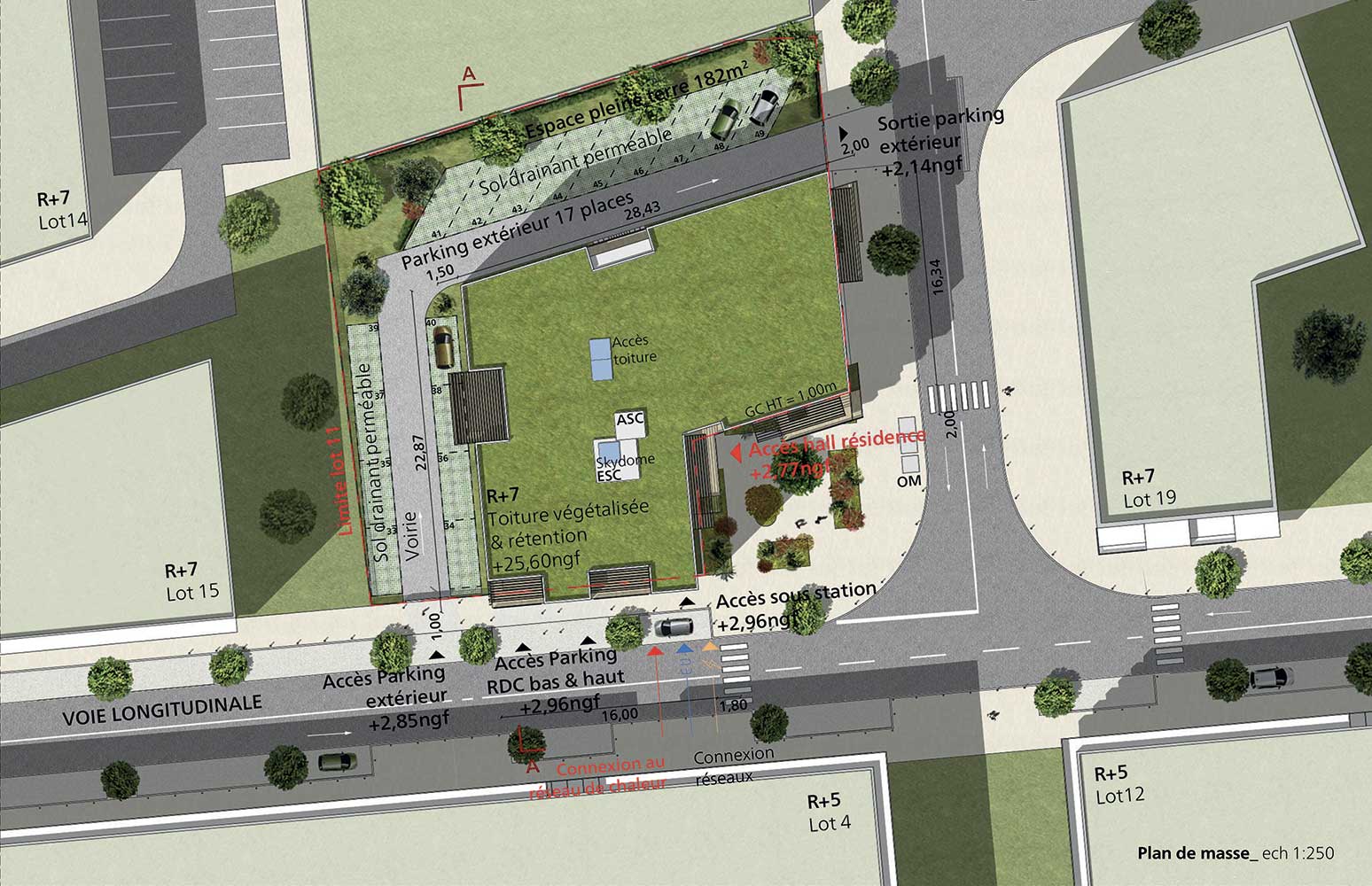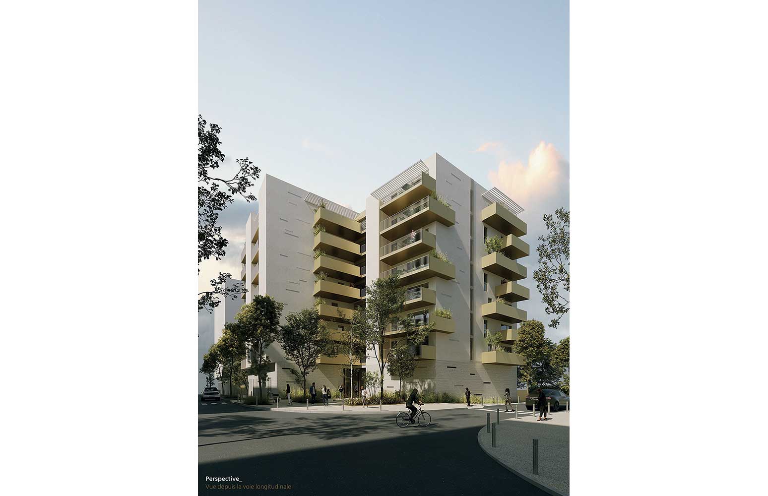 - Proposition non retenue – Perspective principale, voie longitudinale (est). Crédit : GAU – Garcia Diaz