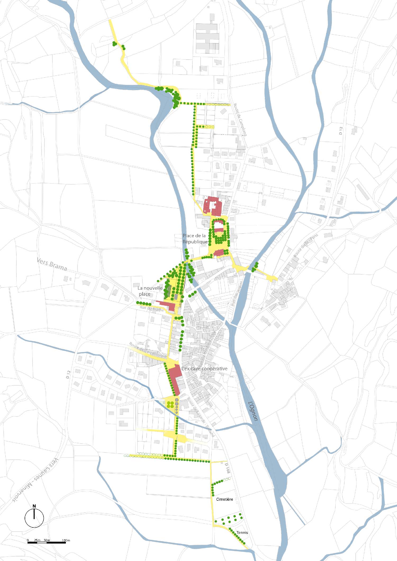 La réflexion préalable menée par le CAUE a permis de proposer un cadre global d’intervention dans lequel s’insèrent les projets successifs. L’espace public est apparu comme un élément fédérateur, avec la “voie douce” qui traverse le village et sur laquelle se greffent équipements, logements, nouvelle place et autres lieux emblématiques comme l’épicerie communale.