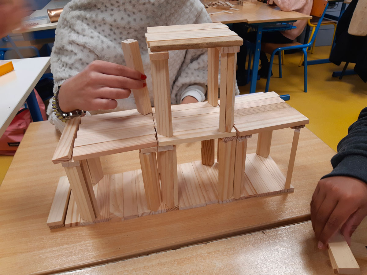 L’apport théorique, sous forme de présentation commentée d’un diaporama, a permis d’aborder la définition de l’architecture et ses cinq principaux éléments (fondations, structure, murs ou enveloppe, ouvertures, toit). Les écoliers ont pu expérimenter les deux principaux types de structures, par empilement de modules et à ossature, en utilisant des Lego et des Kapla.
