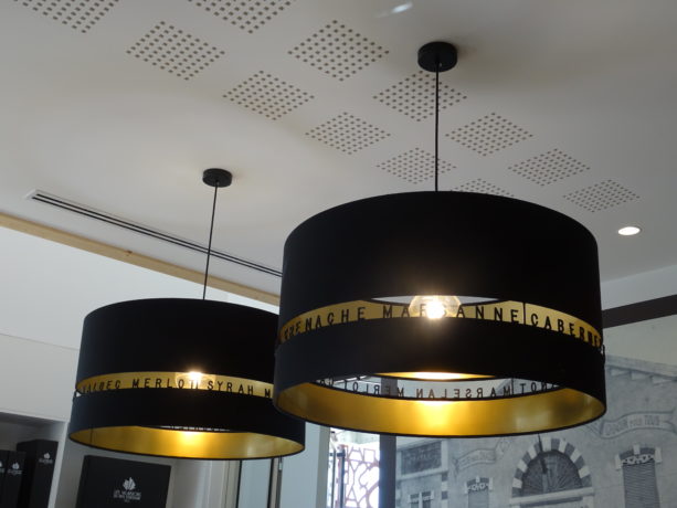 - Les luminaires du comptoir avec les noms des cépages.