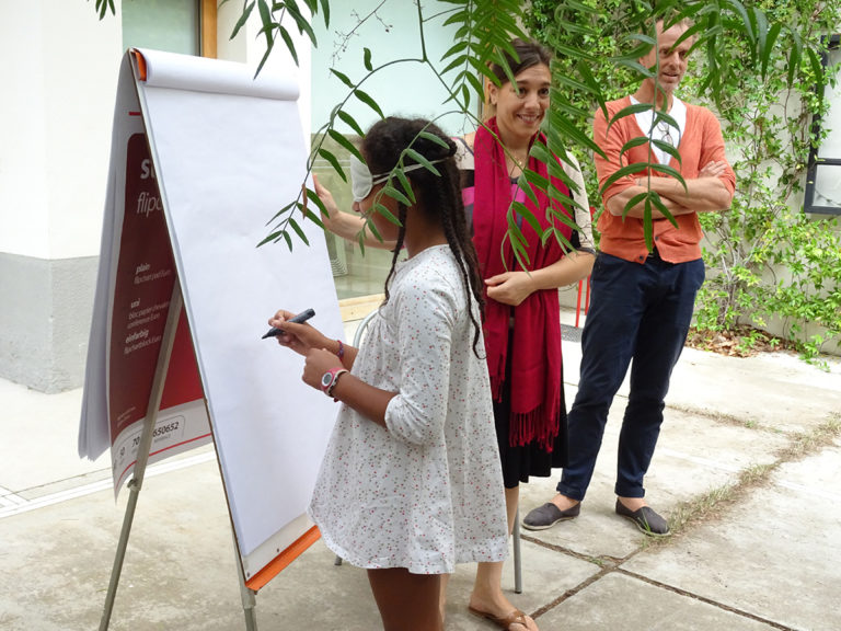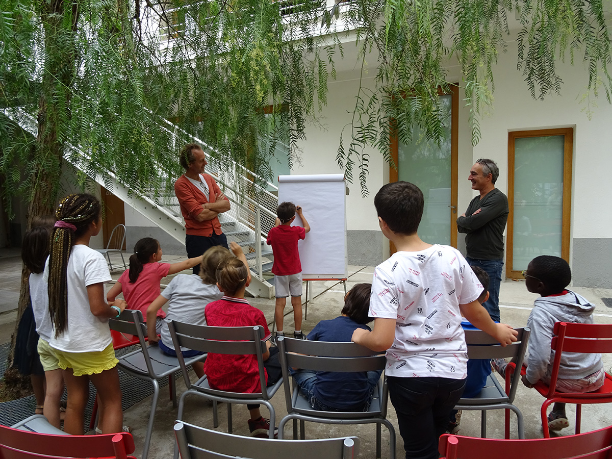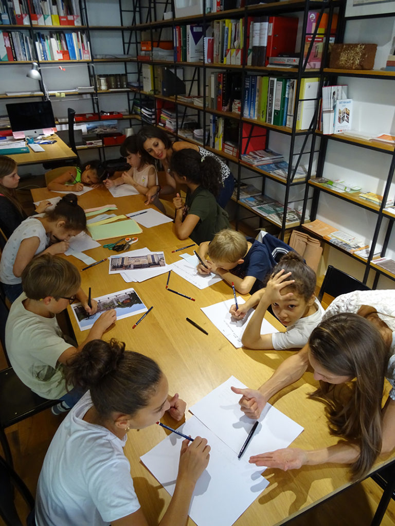 Répartis ensuite en “petits comités”, les élèves participent successivement à trois ateliers de 35 minutes : une animation sur la “Reconversion, mutation, transformation” de bâtiments montpelliérains ; un atelier d’écriture de Haïkus à partir de lectures de l’ouvrage « Montpellier, secret et insolite » de Marie SUSPLUGAS ; et un jeu “Dessine à l’aveugle” où le lexique à faire découvrir les yeux bandés fait subtilement référence à la solution de l’énigme…