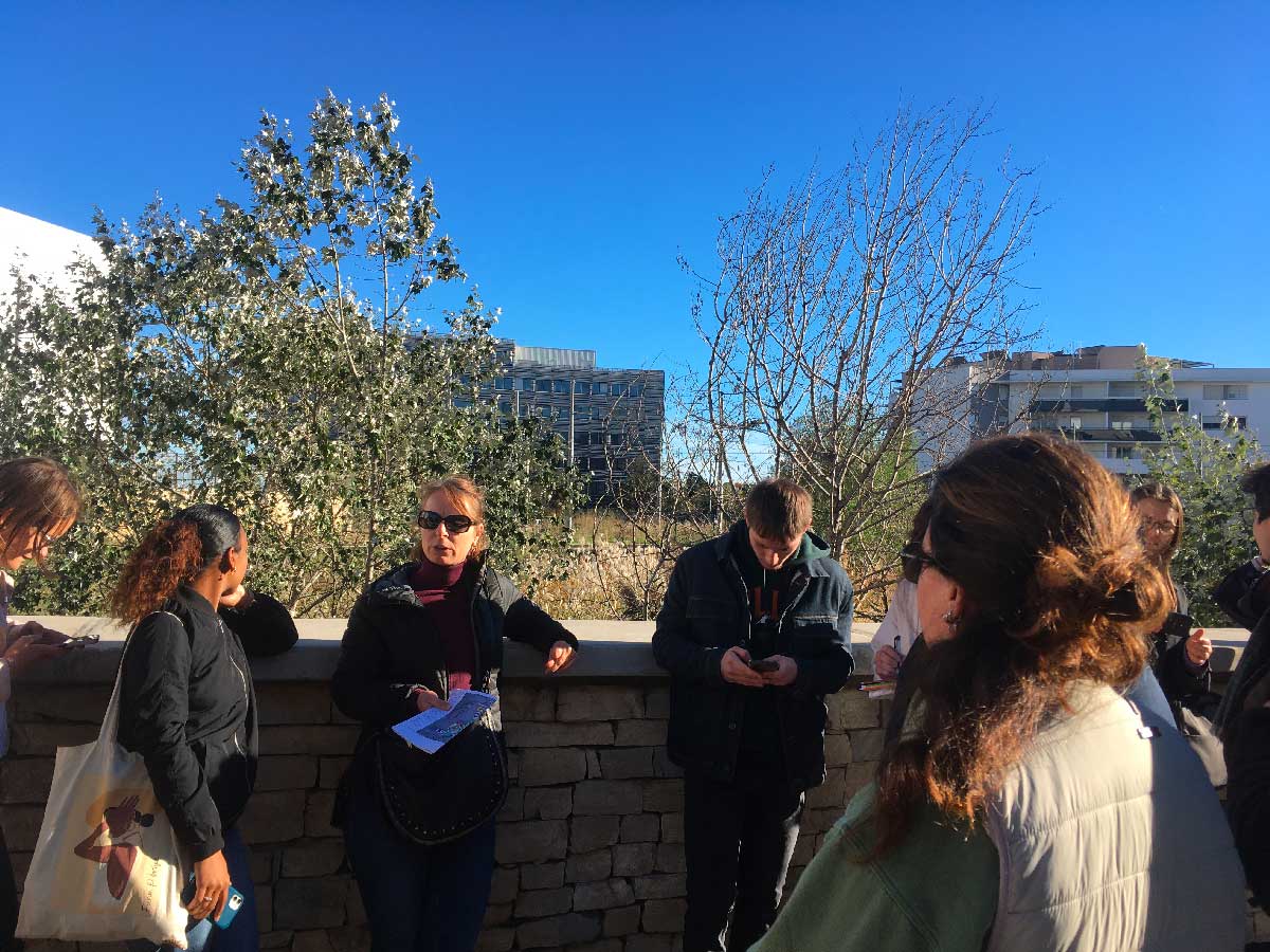 Guidés par Aurélie MARCON, ingénieur d’études en environnement, ainsi que par Lydie CHAMPONNOIS, architecte-urbaniste au CAUE 34, les étudiants ont pu découvrir un bref historique du développement urbain de Montpellier, puis le contexte de la création de cet éco-quartier, dans le cadre général de la politique des Zones d’aménagement concerté (ZAC) de Montpellier.