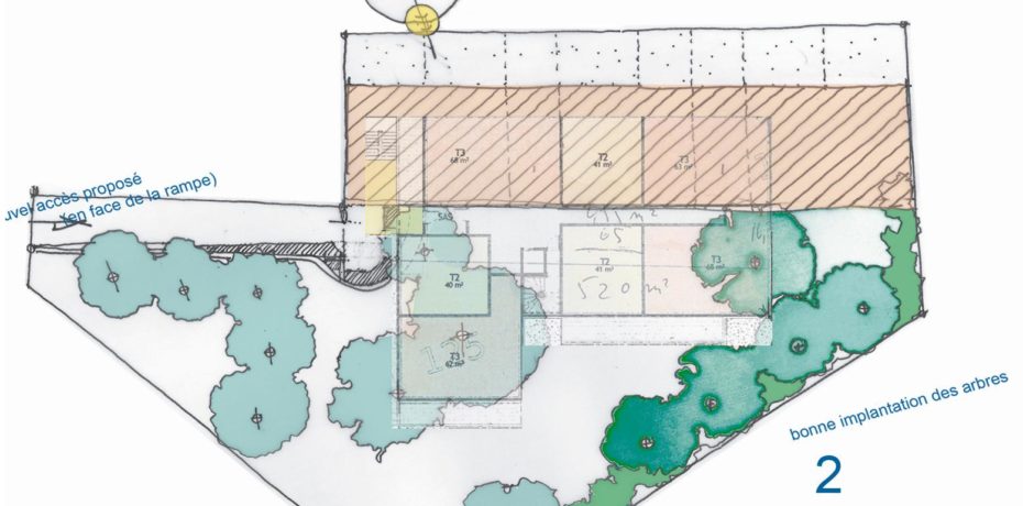 En effet, les premiers croquis d’intention remis à l’échelle et chiffrés respectaient parfaitement les contraintes du PLU mais oubliaient de prendre en compte les caractéristiques environnementales de ce terrain.