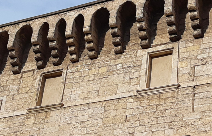 Gros plan sur les machicoulis : balcons au sommet des murailles, percés d’ouvertures (permettant de laisser tomber des projectiles sur l’ennemi).