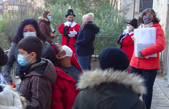 Les enfants ont eu tout d’abord le privilège d’être accueillis à l’intérieur de la Tour des Pins par des représentants des “Barons de Caravètes” – où la confrérie y est logée depuis 2003 – vêtus du costume d’apparat dont la tradition perdure depuis 1273 : longue robe rouge, chemise à large col et gants blancs, chapeau noir…