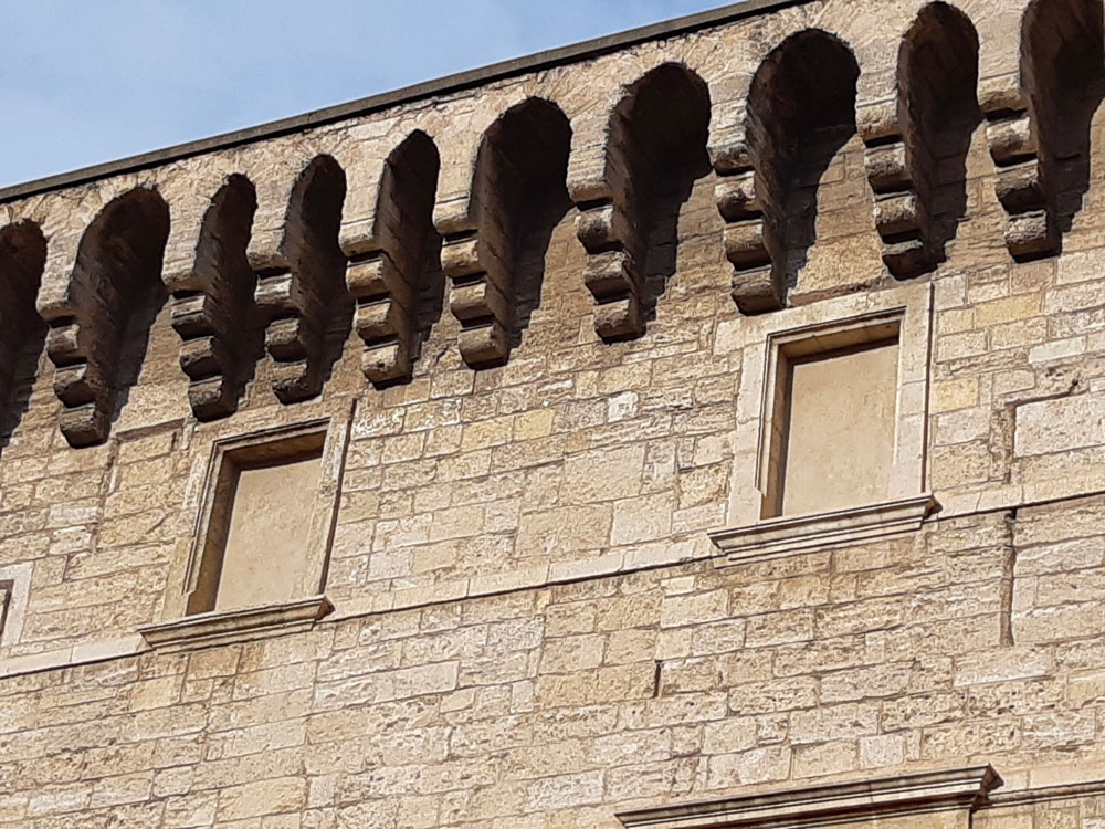Gros plan sur les machicoulis : balcons au sommet des murailles, percés d’ouvertures (permettant de laisser tomber des projectiles sur l’ennemi).
