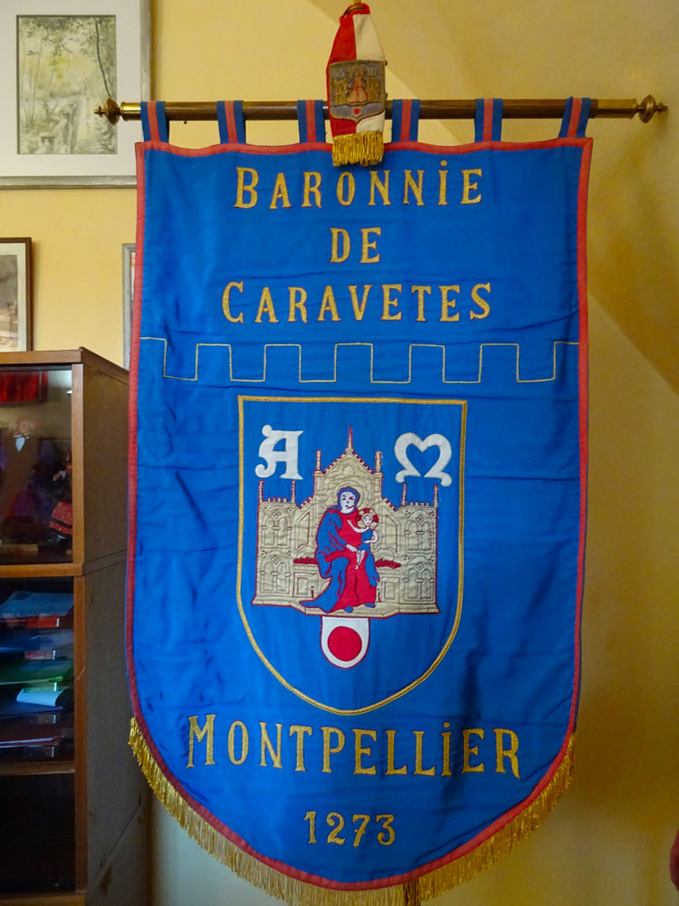 Sur ce blason, le rond rouge représente Saint Guilhem, et juste au-dessus, on y aperçoit la Vierge Marie.