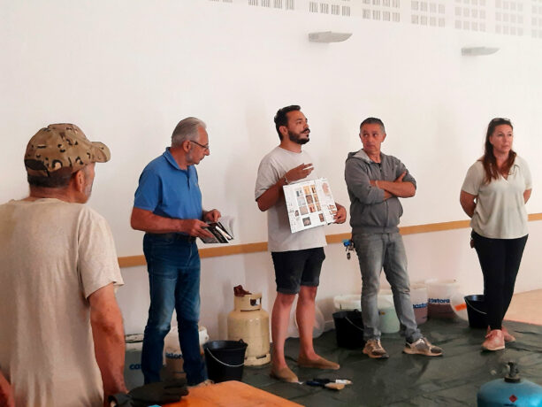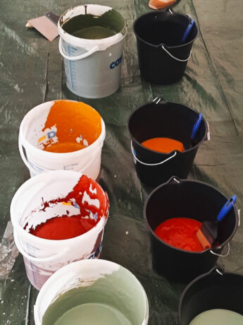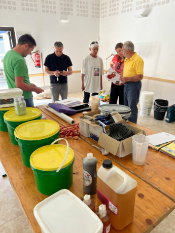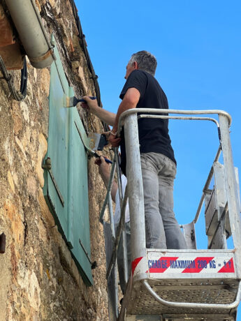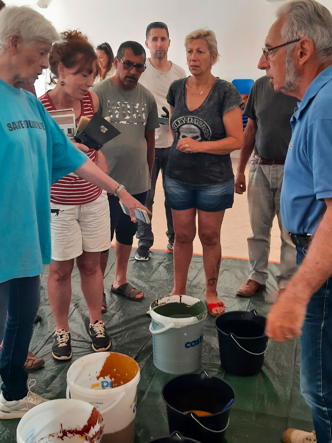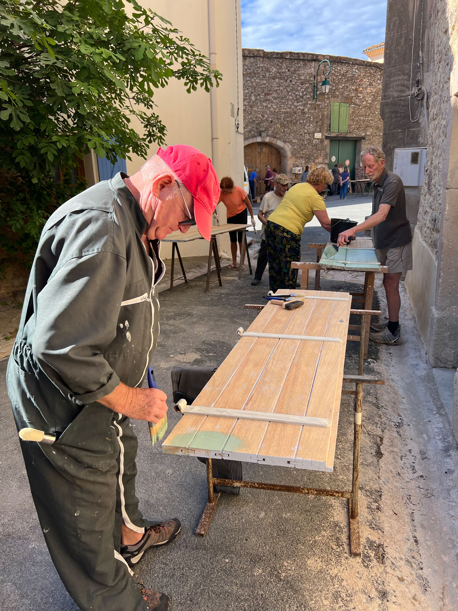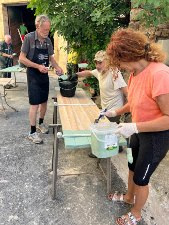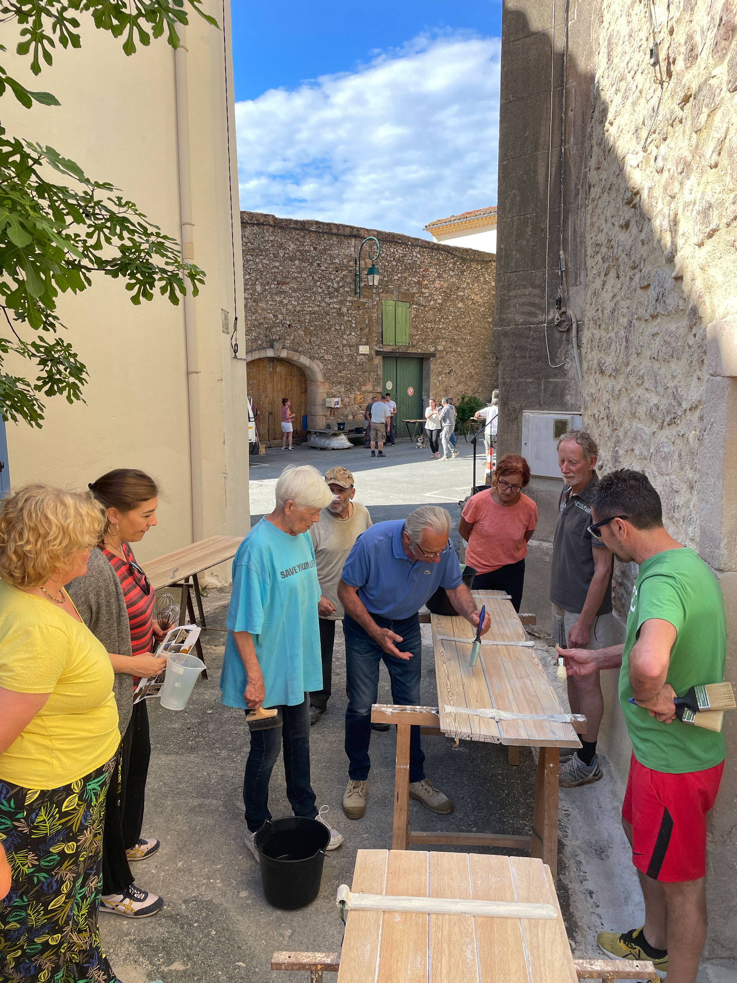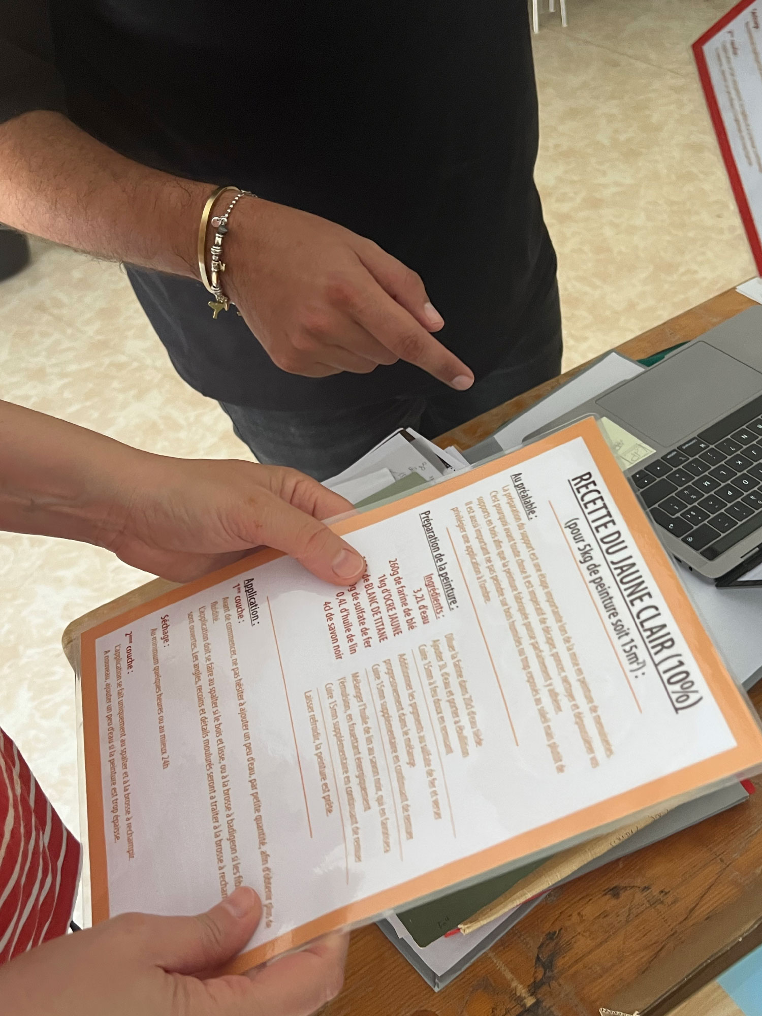 La veille de l’opération, l’équipe du CAUE avait pris soin de préparer les bases de peinture. De même, “tous les propriétaires avaient au préalable sablé / poncé leurs supports” explique Mickaël ARJONA, architecte conseiller au CAUE 34, et coordinateur de la journée. Une étape essentielle pour que la peinture puisse être appliquée efficacement et qu’elle résiste au temps et au climat.