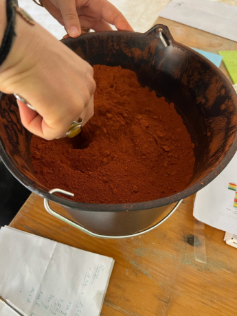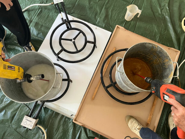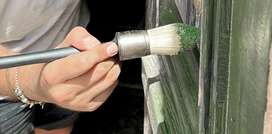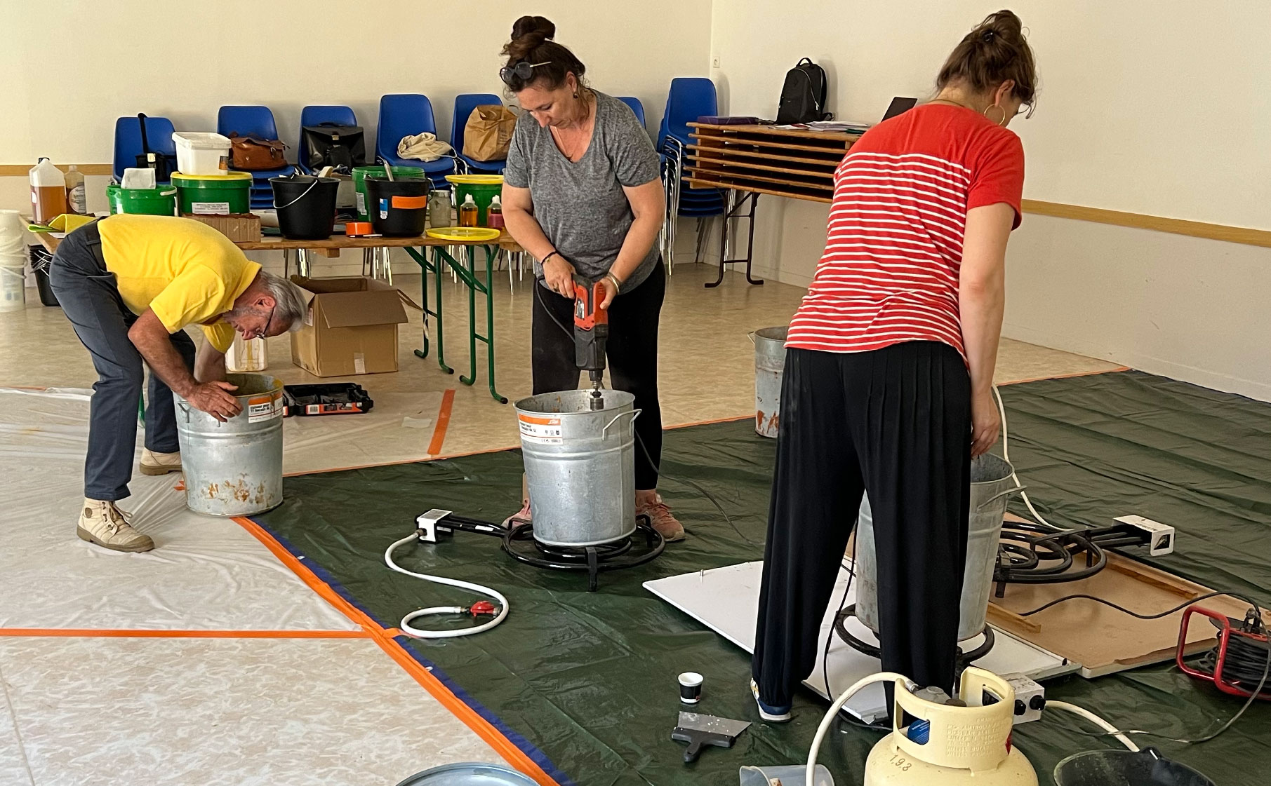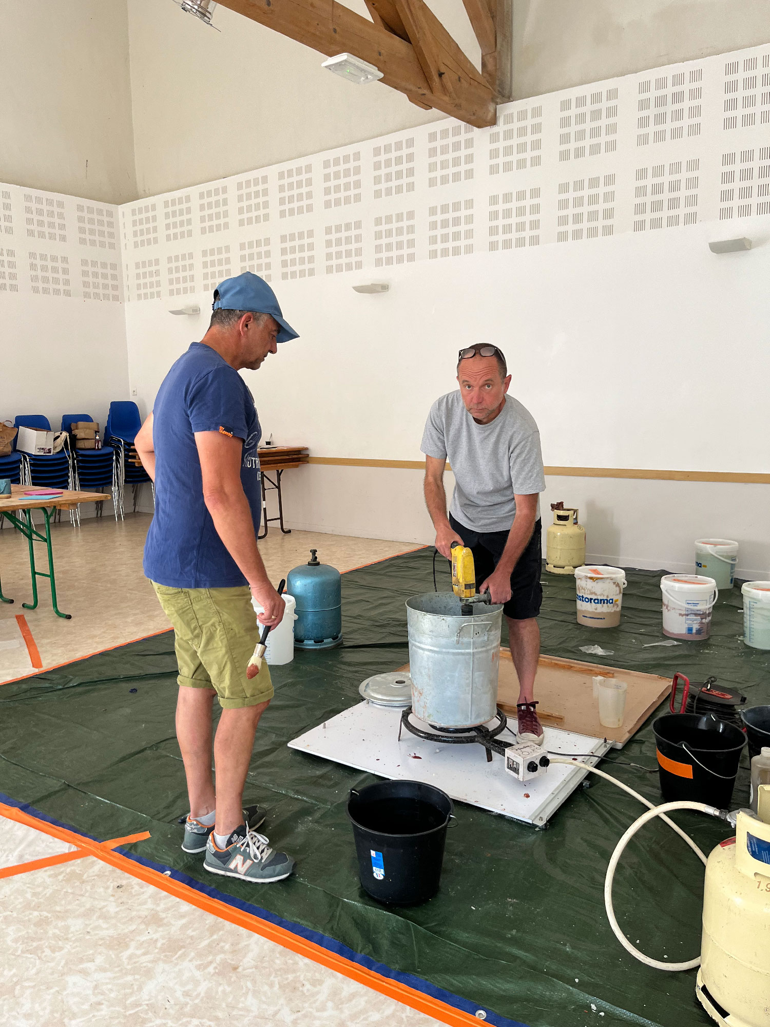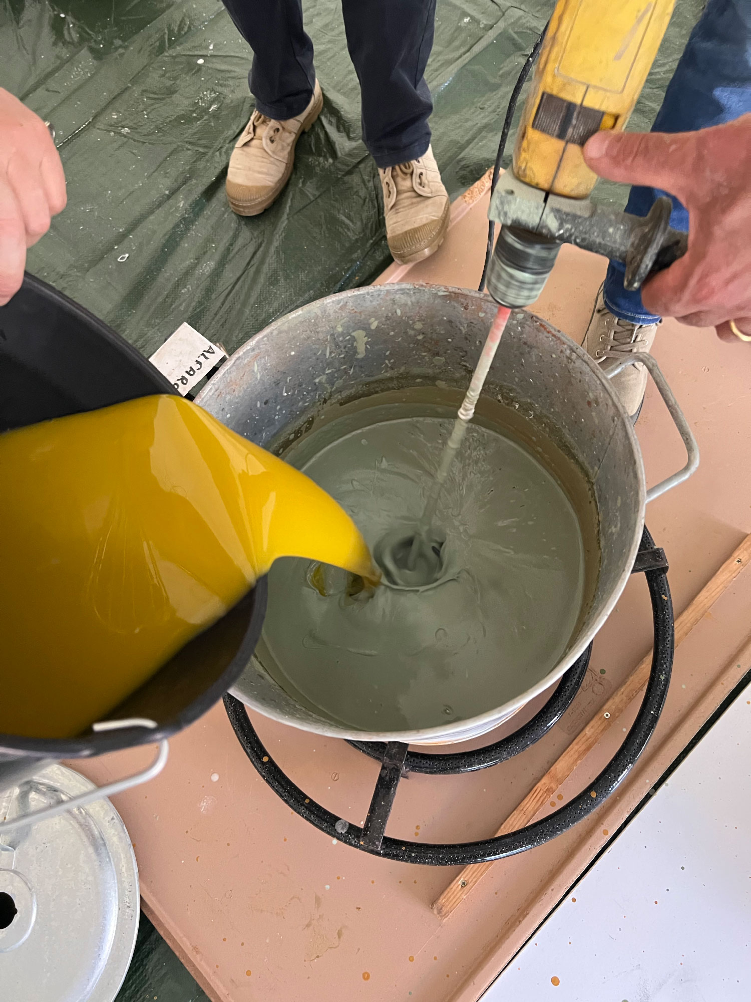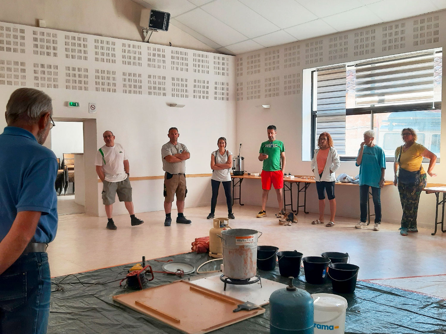 La veille de l’opération, l’équipe du CAUE avait pris soin de préparer les bases de peinture. De même, “tous les propriétaires avaient au préalable sablé / poncé leurs supports” explique Mickaël ARJONA, architecte conseiller au CAUE 34, et coordinateur de la journée. Une étape essentielle pour que la peinture puisse être appliquée efficacement et qu’elle résiste au temps et au climat.