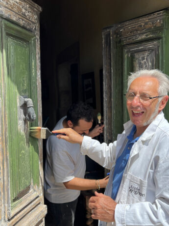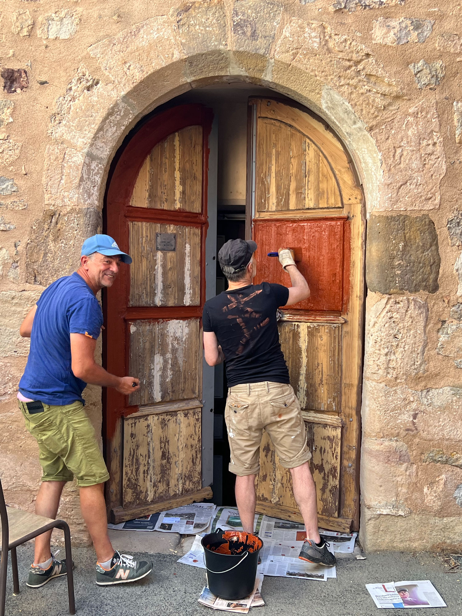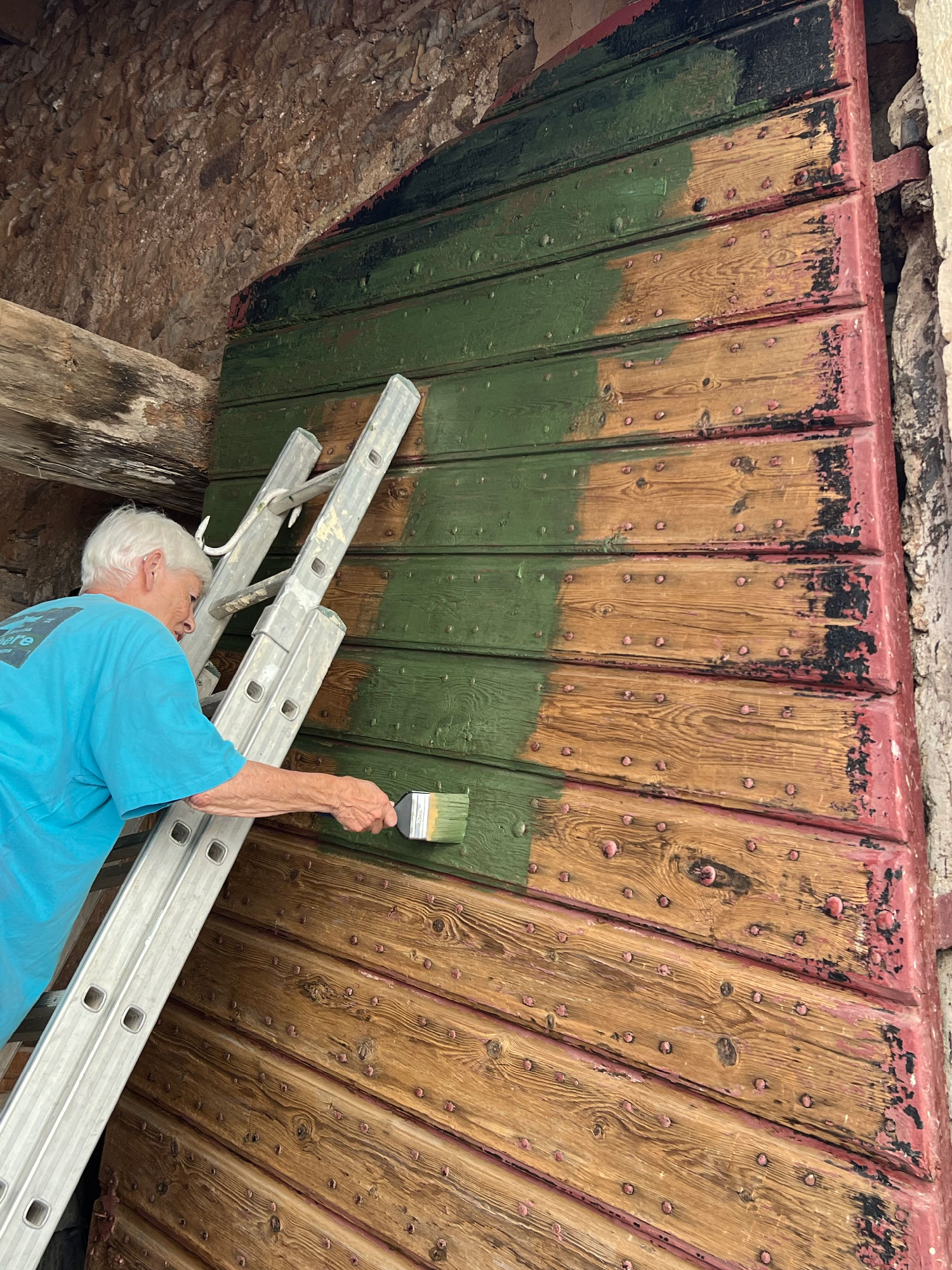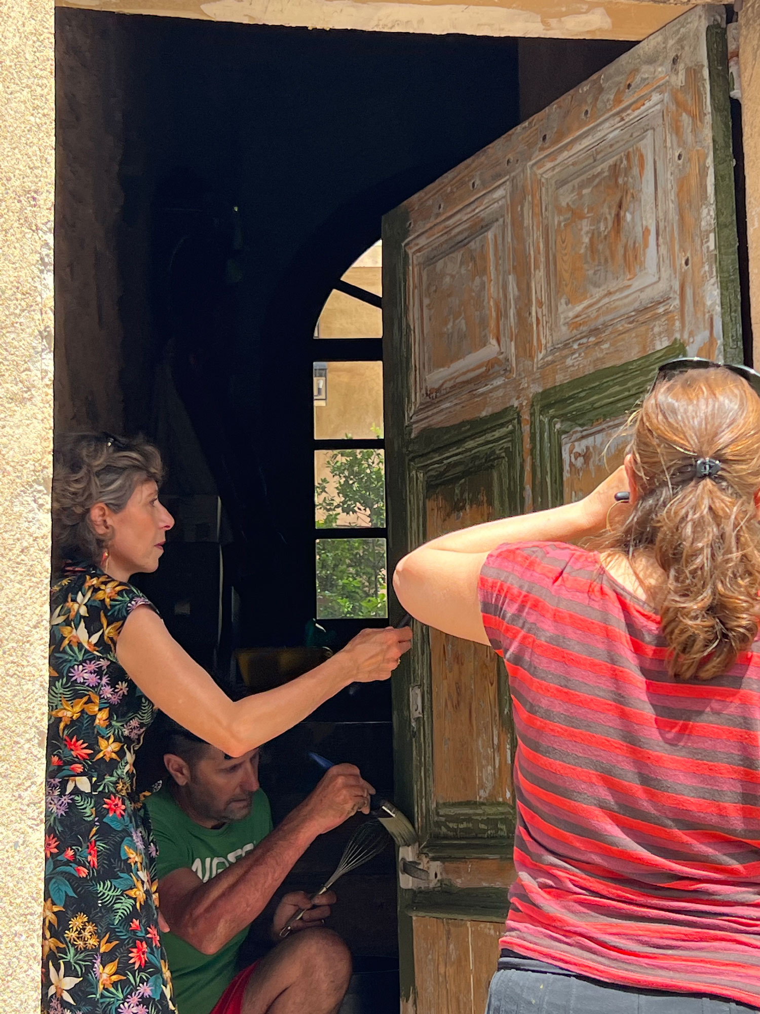 Neuf maisons étaient concernées. Portes, portails et volets en bois ont été peints avec des peintures naturelles de quatre teintes différentes : rouge et jaune (à base d’ocre), vert clair et vert foncé (à base de terre verte).