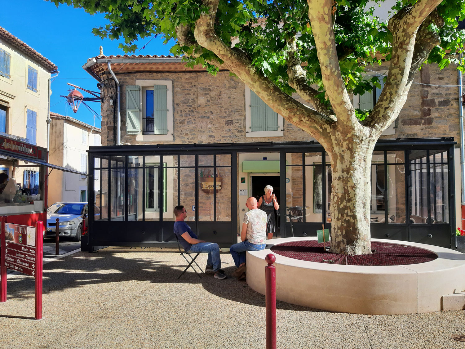 La terrasse abritée, réalisée par Mathilde BEJOT, architecte, à partir des conseils du CAUE 34, permettra d’étendre l’activité de l’épicerie et de consolider son économie.