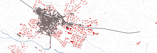 2013, trame bâtie avec le centre médiéval et XIXe en gris, les extensions XXe en rouge – © CAUE 34