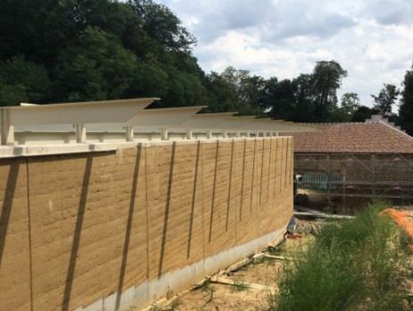 Salle culturelle et tribunes, Monoblet (Gard), 2017. Y. Perret et F. Perrin, architectes. Terre-paille banchée de 300 kg/m3 en ossature bois.