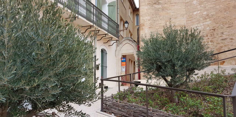 - La cour d’entrée de la médiathèque est un espace exigu, en forme d’entonnoir, sombre et exclusivement fonctionnel. L’entrée dans la médiathèque se fait au fond de la cour, par l’extension bâtie réalisée à la fin des années 1980.