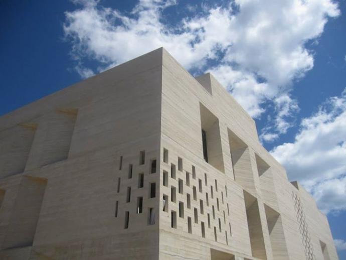 L’édifice massif est en béton clair coulé sur place, laissé brut et apparent à l’intérieur comme à l’extérieur