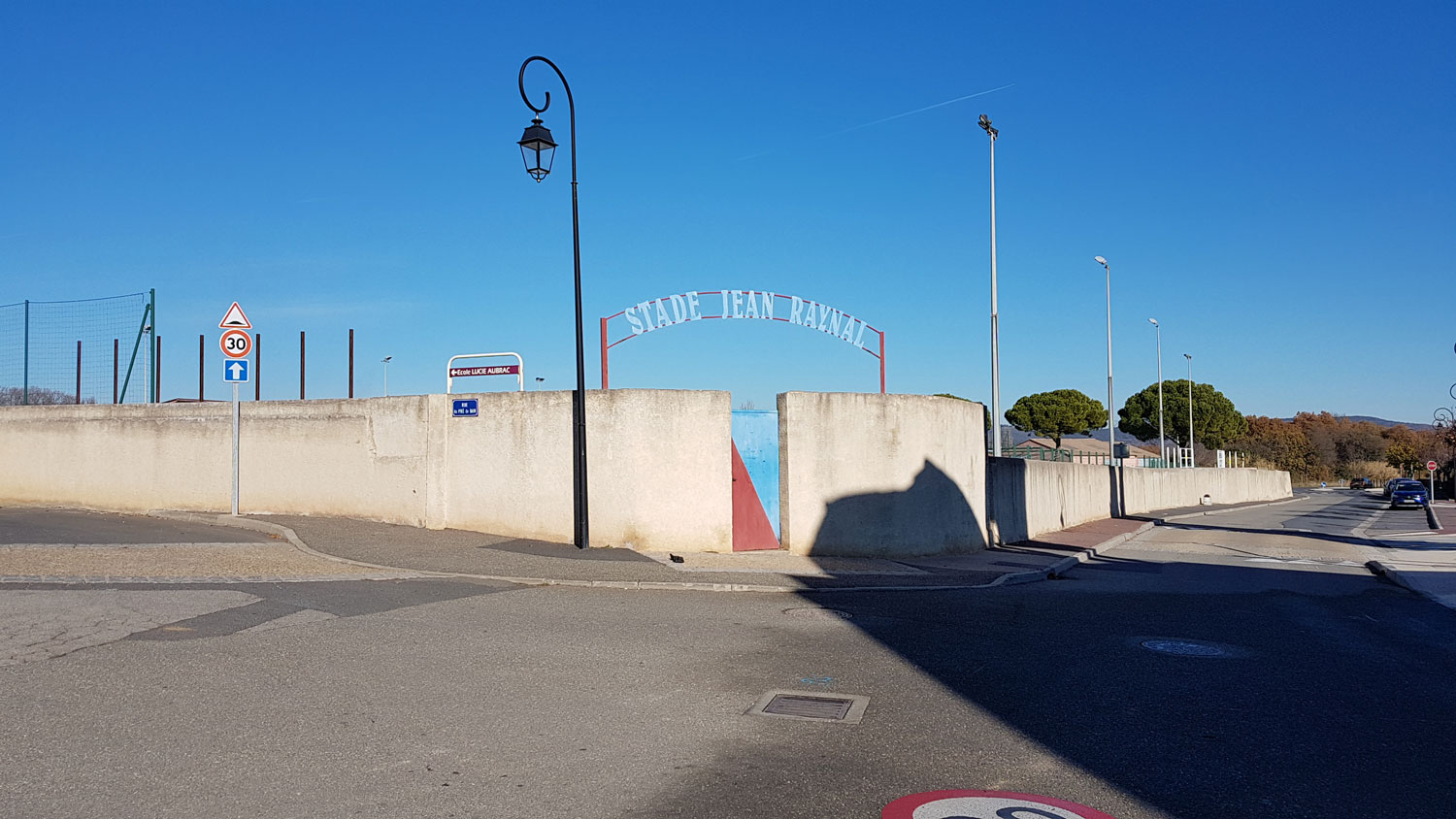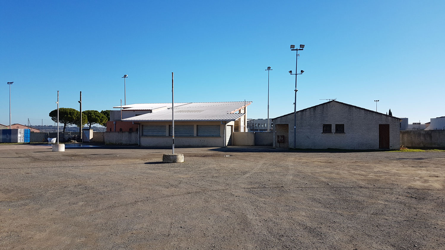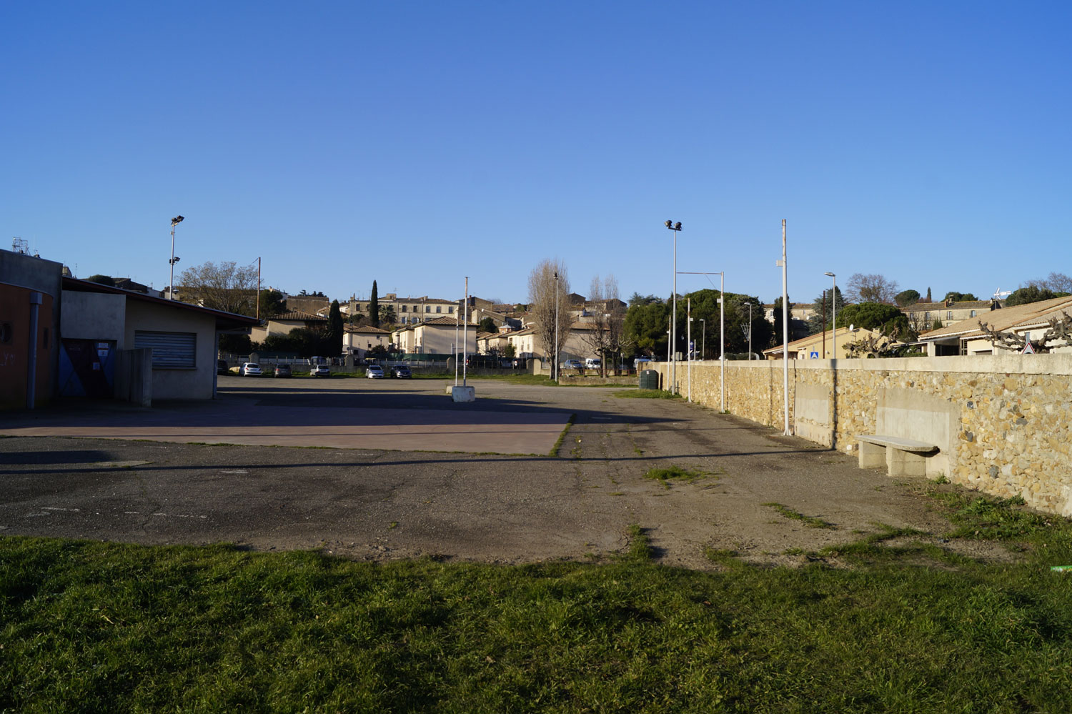 Le souhait de la municipalité est d’aménager un îlot, à proximité du stade, accolé au centre ancien sur sa frange Est, ouvert sur les coteaux de la Peyne et le ruisseau du Ligno coté Ouest. La maîtrise foncière, communale, comprend une grande parcelle qui accueille divers usages au gré des besoins – parking, installation de manèges lors des fêtes de village ou d’école, concours annuel de pétanque, etc – ainsi que les espaces publics attenants. L’ensemble, complexe, est composé de nombreux équipements implantés au coup par coup.