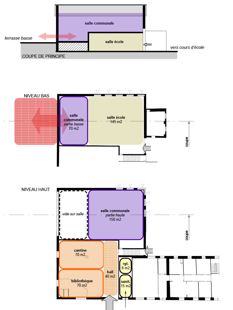 - La restructuration envisagée de l’ensemble salle communale, coworking, cantine, salle école.