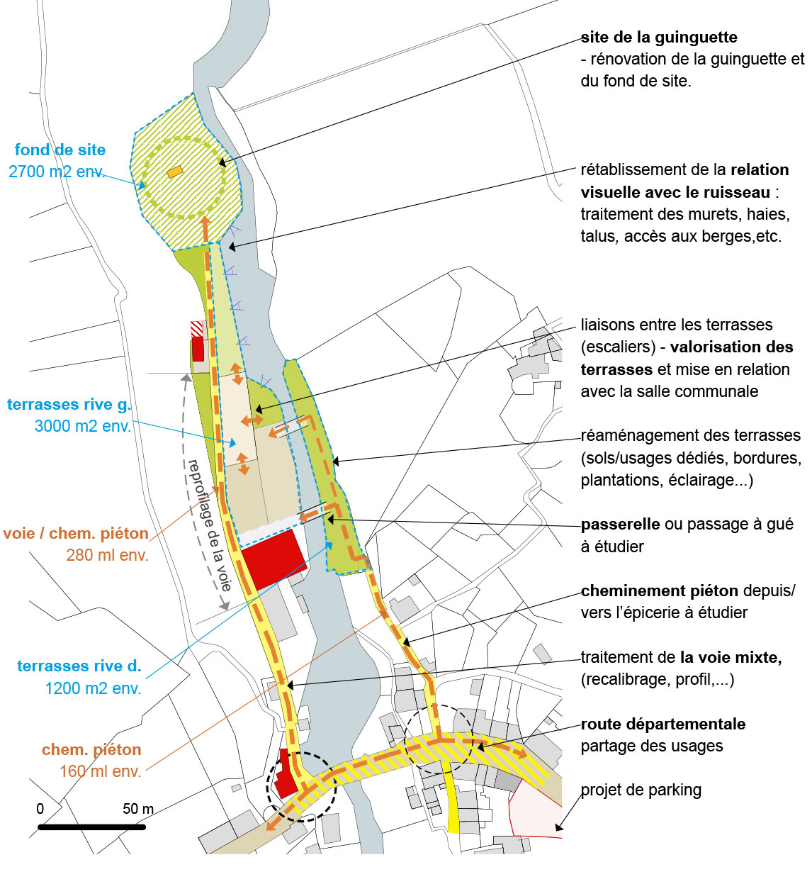 Un diagnostic des espaces “libres” a permis de définir un périmètre de projet pertinent ainsi qu’un scénario schématique de requalification et de mise en valeur du site, prenant en compte la réorganisation des activités. À l’issue de ces préalables, la municipalité s’est engagée dans la phase pré-opérationnelle du projet d’aménagement du site sur la base d’un cahier des charges rédigé par le CAUE 34.
