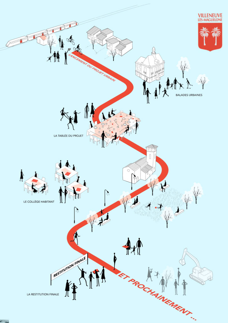 Tout au long de l’étude, une démarche de concertation et de co-construction a été mise en place : “Les Villeneuvois ont été sollicités pour exprimer leurs attentes par le biais de rendez-vous. Un Collège habitant a également été constitué afin d’émettre un avis consultatif sur les propositions du projet.” (extrait de la restitution de l’étude urbaine, 27.02.2023)