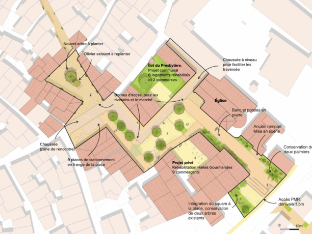 Villeneuve-lès-Maguelone – Pl. du marché et de l’église : ambiances recherchées. Crédit : La Strada urbanistes