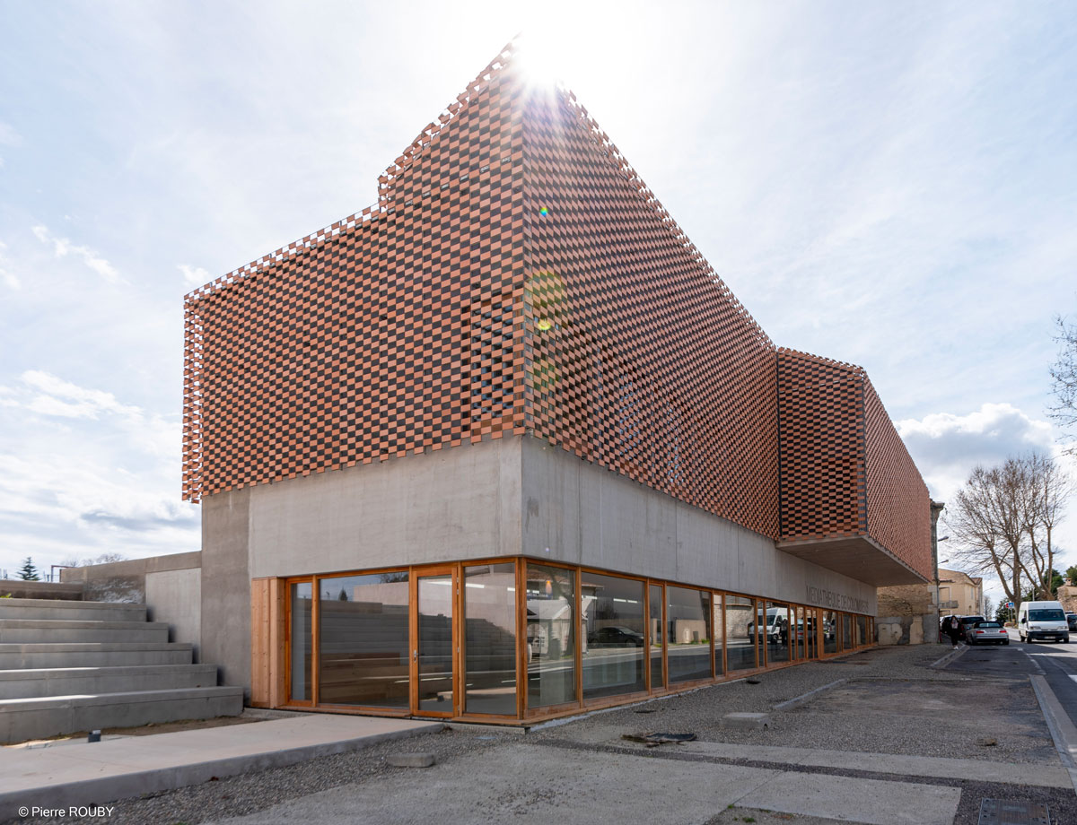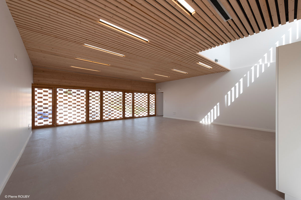 La vêture de cet équipement – en résille de briques de terre cuite – fait le lien avec les matières de l’école type Jules Ferry mitoyenne, sans pour autant renoncer à une écriture contemporaine de l’enveloppe et des volumétries. Elle permet également de filtrer et de jouer avec la lumière.