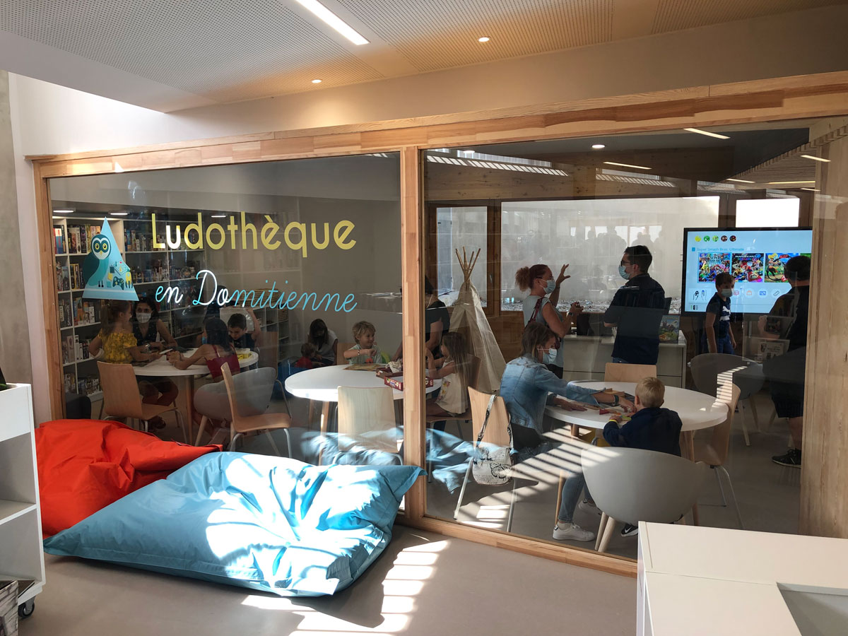 L’équipe de maîtrise d’œuvre (AlteaBois – Energetec- Atelier Rouch) rassemblée autour d’Isabelle Arnold (AR Architecture) a livré à la commune la médiathèque/ludothèque d’une superficie de 335 m2 qui prend place en rez-de-chaussée au contact de la rue des écoles, et fait le lien entre la centralité du port, les écoles et la mairie.