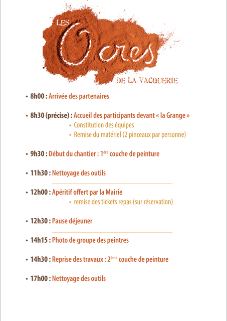 - 8 h 30 (précise) : accueil des participants devant “la grange” (constitution des équipes, remise du matériel 2 pinceaux / personne)