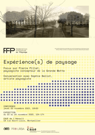 La Fédération française du paysage vous invite à une conférence* jeudi 23 novembre à 18 h 30 avec Pierre PILLET, paysagiste concepteur de la Grande-Motte, en conversation avec Sophie BELLOT, artiste paysagiste. Cette dernière présentera une exposition photographique du 20 au 24 novembre 2023, de 10 h à 17 h, au CAUE de l’Hérault.