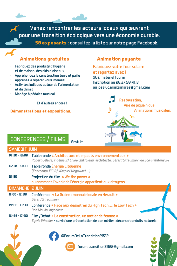 Parmi la cinquantaine d’exposants, le CAUE de l’Hérault sera de la partie pour participer au 1er Forum de la transition écologique de Viols-en-Laval. Il y en aura pour tout le monde ! Animations, table ronde, projection de films documentaires et des expositions dont celle du CAUE 34 : Vivre et construire avec le climat en Languedoc-Roussillon.