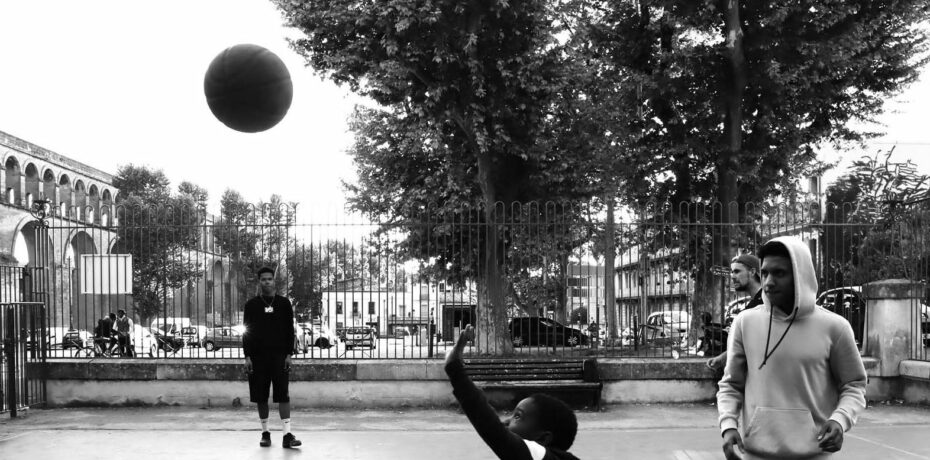 Ce ne sont pas les échanges de ballon, dans l’espace clos du terrain de basket, que nous retiendrons de ces photos, mais bien les liens de fraternité qui s’y jouent.