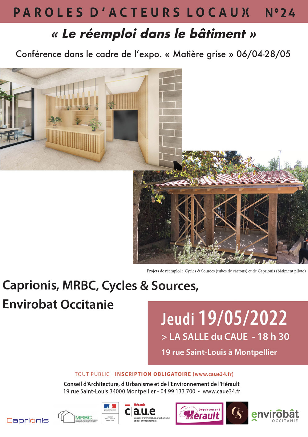 En accompagnement de lexposition “Matière grise : Matériaux / Réemploi / Architecture” exposée à Montpellier, simultanément au Centre d’art La Fenêtre et au CAUE de l’Hérault, du 6 avril au 28 mai 2022, et après la conférence d’Isabelle BARDY, baubiologue, le CAUE 34 vous invite à une table ronde :