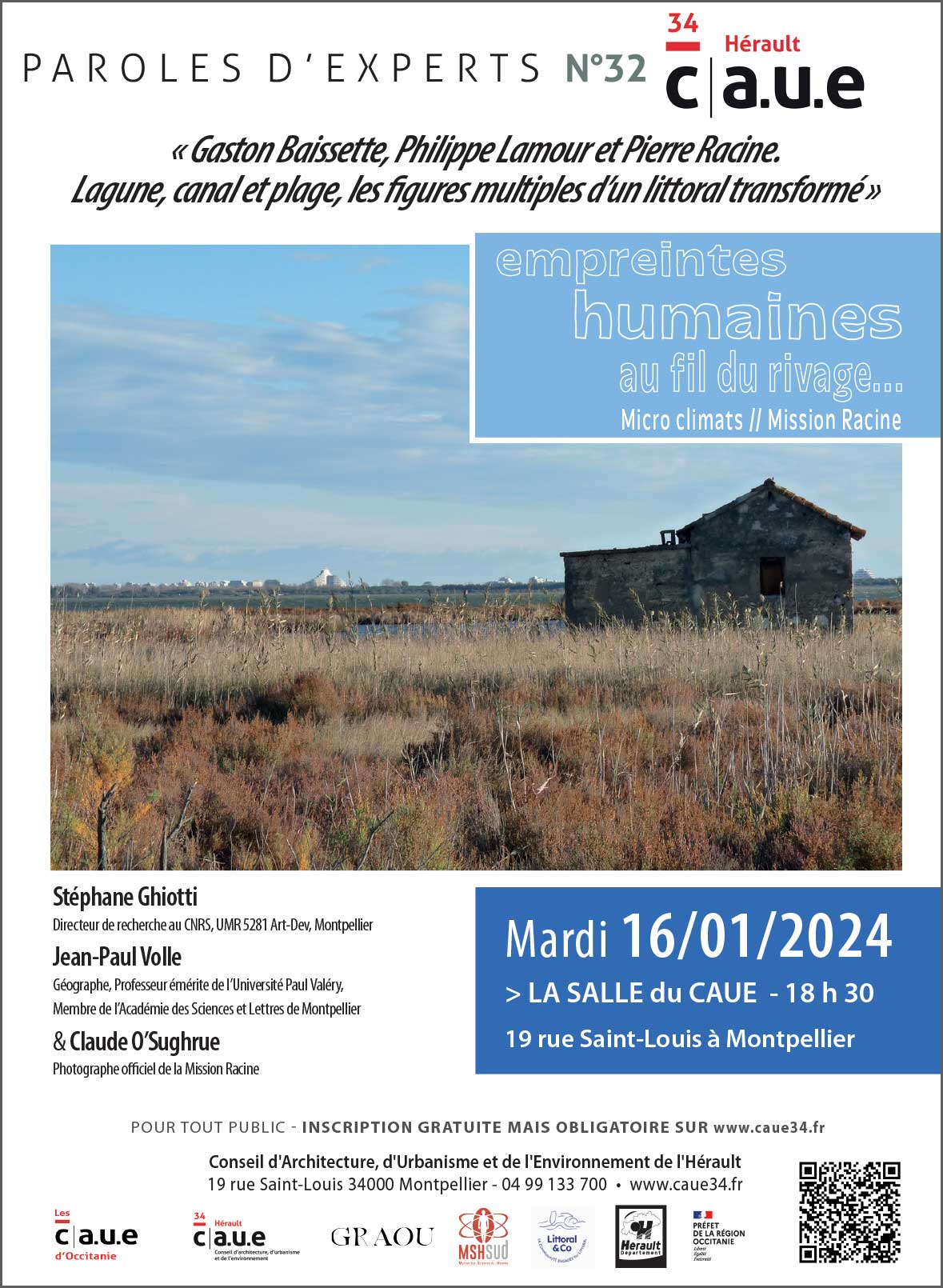 Dans le cadre de la double exposition “Empreintes humaines” au fil du rivage…, présentée au CAUE de l’Hérault jusqu’au vendredi 1er mars 2024, le CAUE de l’Hérault – en partenariat avec la Maison des Sciences de l’Homme SUD (MSH SUD) et le Groupe de Recherche en Architecture OUvert.e (GRAOU) – vous invite à la conférence :