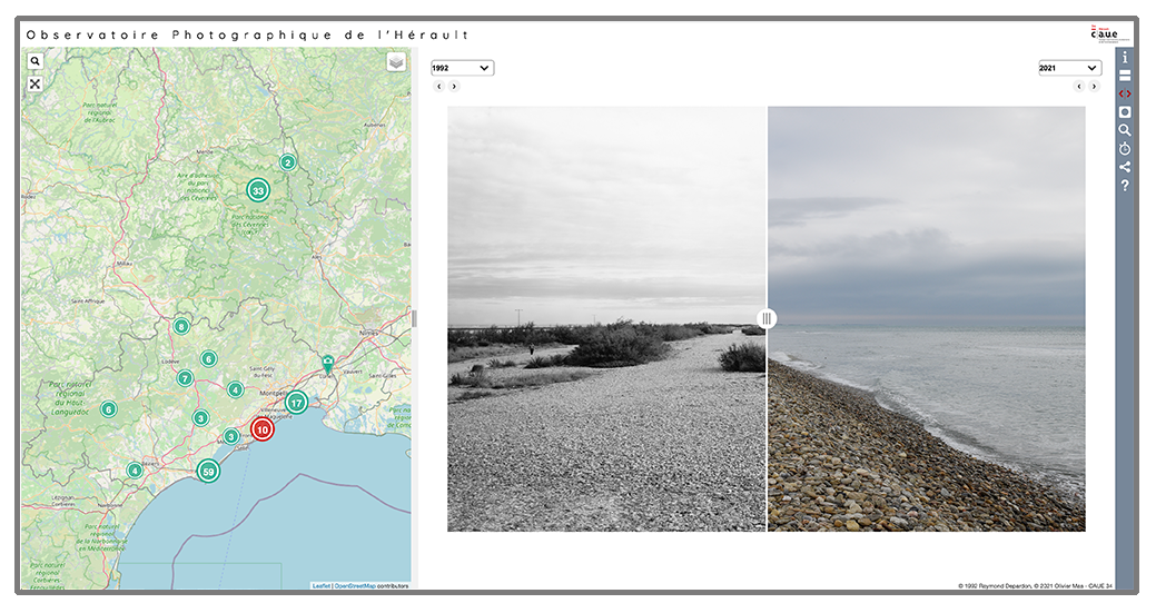 Pensez bien à utiliser l’ascenseur (barre de défilement) de votre navigateur pour lire les légendes du bas de la carte. À droite des photos, vous trouverez différents boutons vous permettant de passer en mode plein écran, de lire des infos techniques, d’utiliser l’outil loupe pour comparer les clichés.