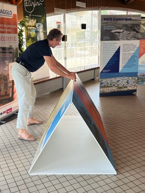 • Pour vos demandes dans l’Hérault, l’exposition se présente sous forme de 8 triptyques en panneaux alvéolaires en polypropylène d’un format vertical de 198 cm x 296 cm. Présentation des panneaux : installation au sol, autostables.