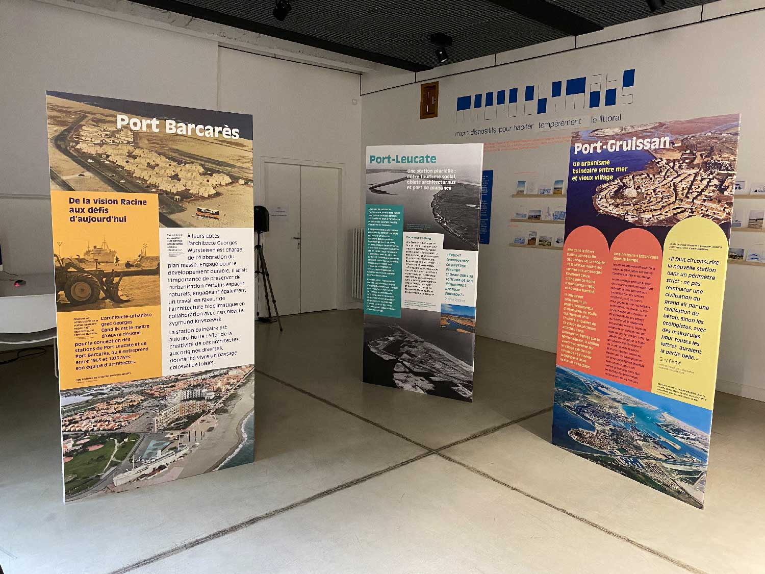 L’exposition comporte 28 panneaux : 3 panneaux de présentation générale de la Mission Racine et 3 panneaux pour les 7 stations touristiques : La Grande-Motte et le Cap d’Agde (Hérault), Port Camargue (Gard), Gruissan et Port Leucate (Aude), Port Barcarès et Saint-Cyprien (Pyrénées-Orientales).